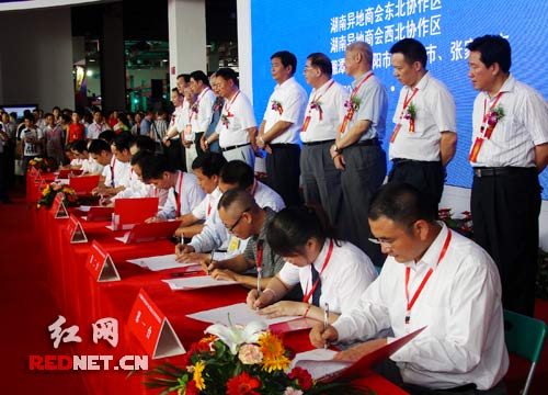 (湖南异地商会西北、东北、华北、华东协作区以及怀化、岳阳、邵阳等市州举行专场签约,共签定产销合作项目485个。)