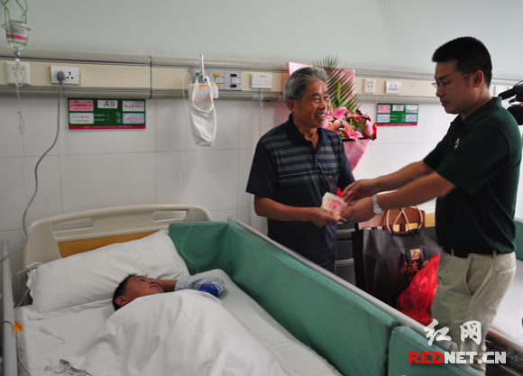长沙“尚友堂老粗布”家纺店的傅延旭在医院看望患有先心病的湘西少年吴兴,并为他捐献1000元爱心款和尚友堂家纺产品。
