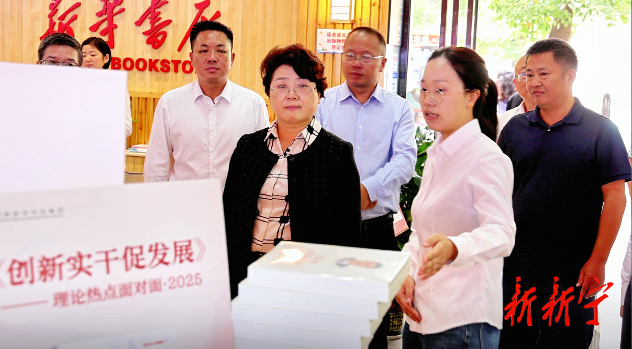 图为市人大常委会党组书记、主任周迎春(中)在新宁县新华书店调研。