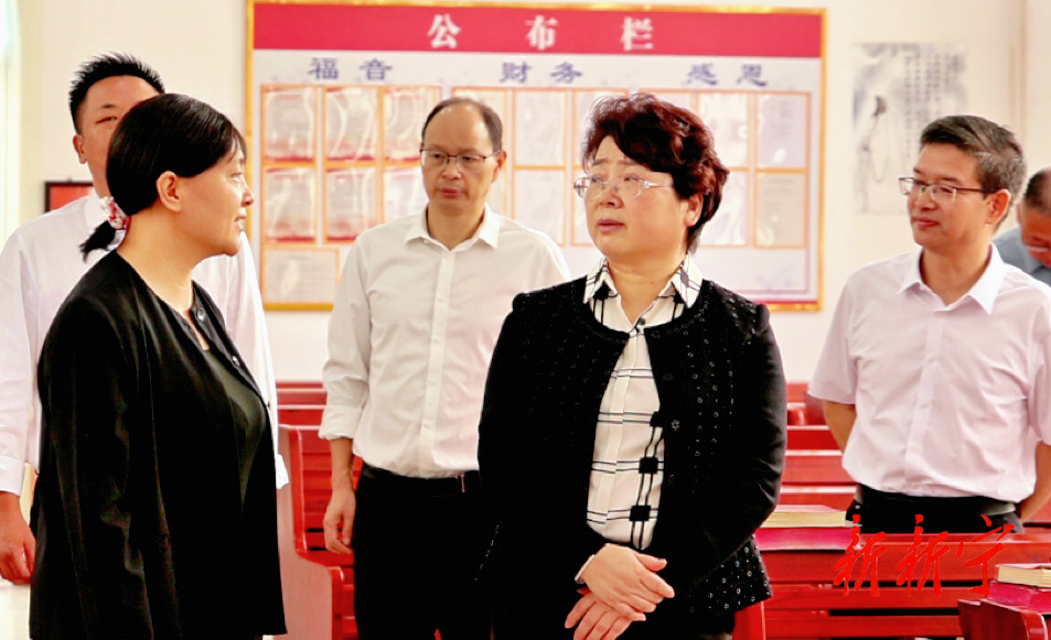图为市人大常委会党组书记、主任周迎春(中)在新宁县基督教堂调研。
