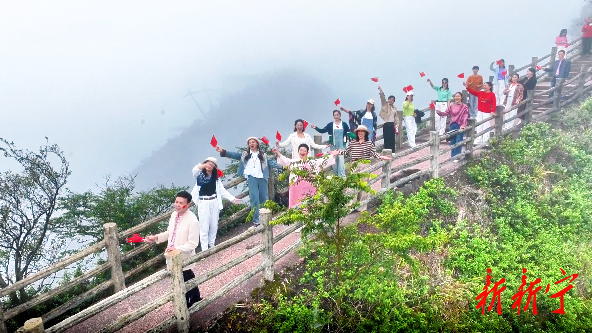 清晨,八角寨上云海翻涌如浪,一轮红日自天际喷薄而出,霞光映照,山影与云涛共浸,宛如一幅流动的水墨画。观景台前,工作人员正向过往的游客发放小国旗及贴纸。随着一声长笛奏响,旗手奋力振臂,鲜艳的五星红旗迎风招展,在晨曦中划出最优美的弧线,现场气氛瞬间被点燃。