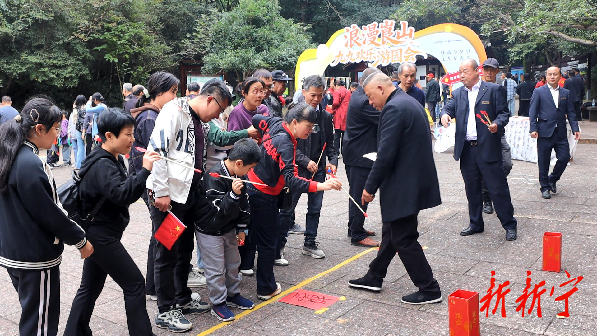 崀山景区组织“浪漫崀山九九欢乐游园会”活动更吸引不少游客参与互动,兴致勃勃地投入到投壶、套圈、滚铁环、免费领取生肖挂件和祈福卡等趣味活动,通过登高祈福方式迎接“九九”重阳节到来,沉浸式体验传统文化与现代旅游巧妙融合乐趣,现场人气火爆、热闹非凡。