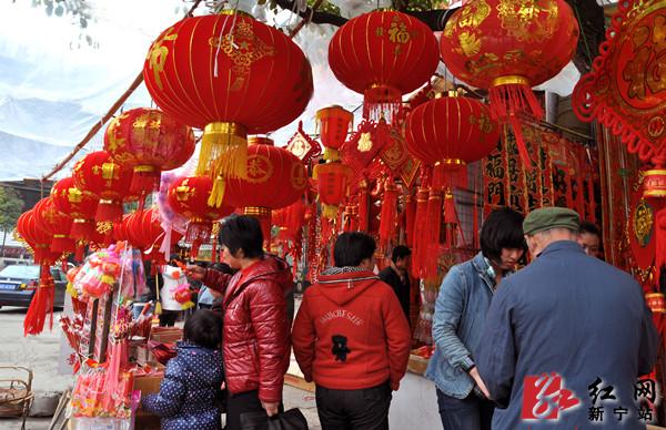 春节临近,县城大街两旁灯笼高挂,市民纷纷选购饰品,喜迎蛇年春节。(郑国华摄)