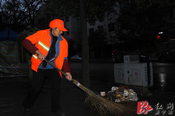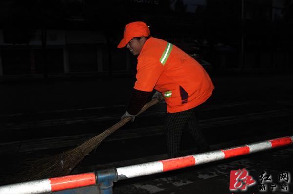 为了县城的洁净亮丽,他们-----新宁的环卫工人每天凌晨5:00起床,拖着板车,带上扫帚、铲子,走上街头,清扫垃圾。晚上6:00,又继续上街。一年三百六十五天,风雨无阻,天天重复一个故事,无怨无悔,令人钦佩。他们被市民称为最美马路天使。