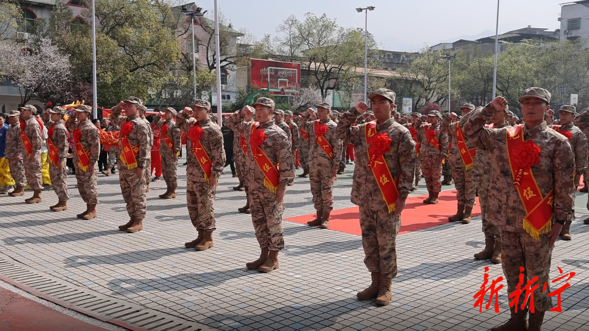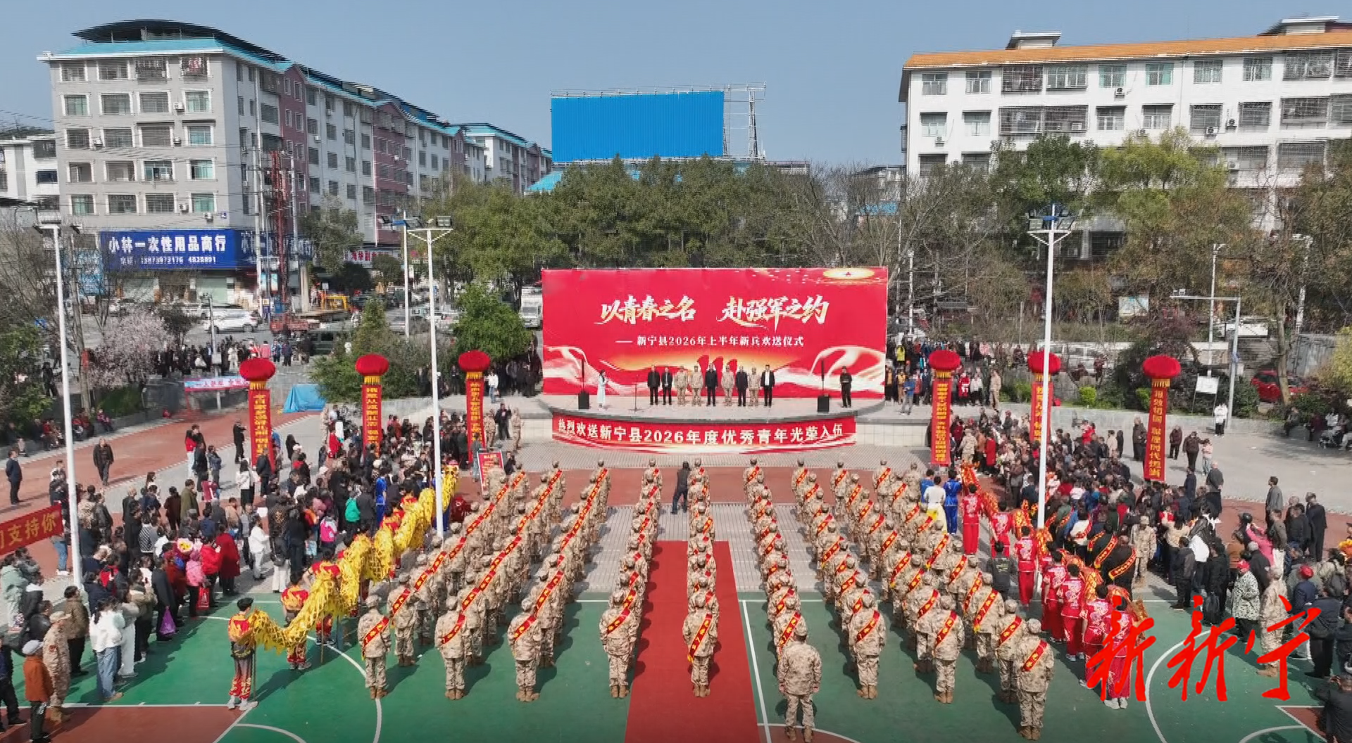 3月13日上午,新宁县2026年度上半年新兵入伍欢送大会暨“全城送兵”活动在县文体广场举行,全体应征入伍青年身着戎装、胸戴红花、肩披绶带,即将奔赴军营,开启军旅生涯,用青春书写保家卫国的壮丽篇章。